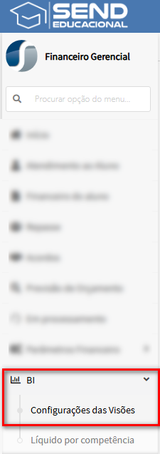 A tela BI > Configurações das Visões permite definir quais informações comporão a visão de Valores Líquidos por Competência, aplicando filtros por Status da Parcela e Categoria da Mensalidade. Essas regras refinam os resultados exibidos nos relatórios e painéis do BI, garantindo leituras alinhadas às políticas financeiras da instituição.