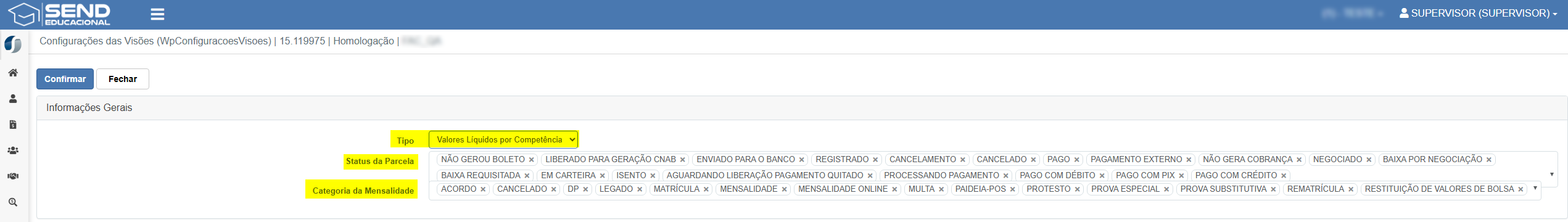 🔹 Categoria da Mensalidade: campo de multi-seleção para limitar a visão a categorias específicas (ex.: MENSALIDADE, DP, MATRÍCULA, REMATRÍCULA, entre outras).