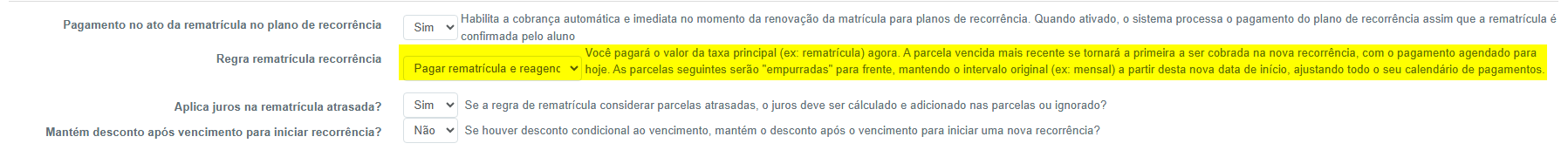 • Aplica juros na rematrícula atrasada?: Se a regra de rematrícula considerar parcelas atrasadas, esta opção define se juros devem ser calculados e adicionados a essas parcelas.image.png
