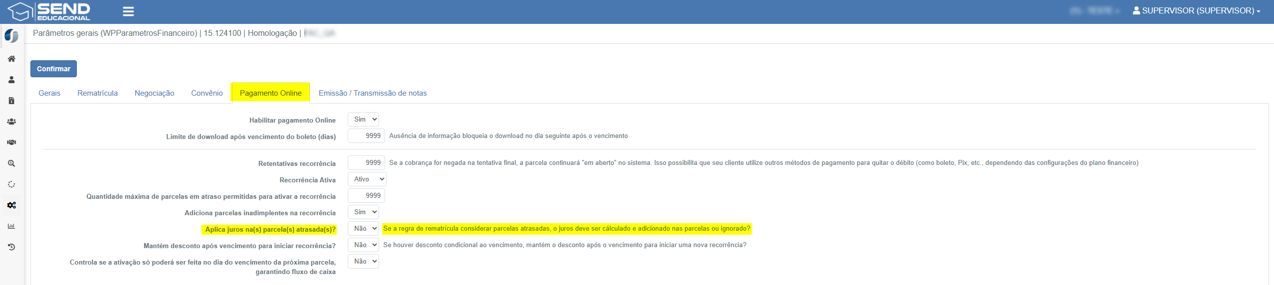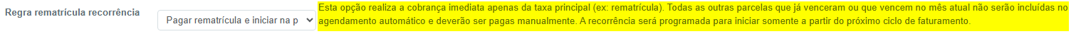 • Aplica juros na(s) parcela(s) atrasada(s)?: Se a regra de rematrícula considerar parcelas atrasadas, os juros devem ser calculados e adicionados nas parcelas ou ignorado?.
