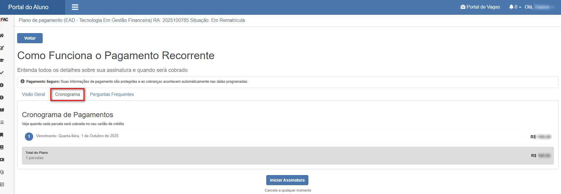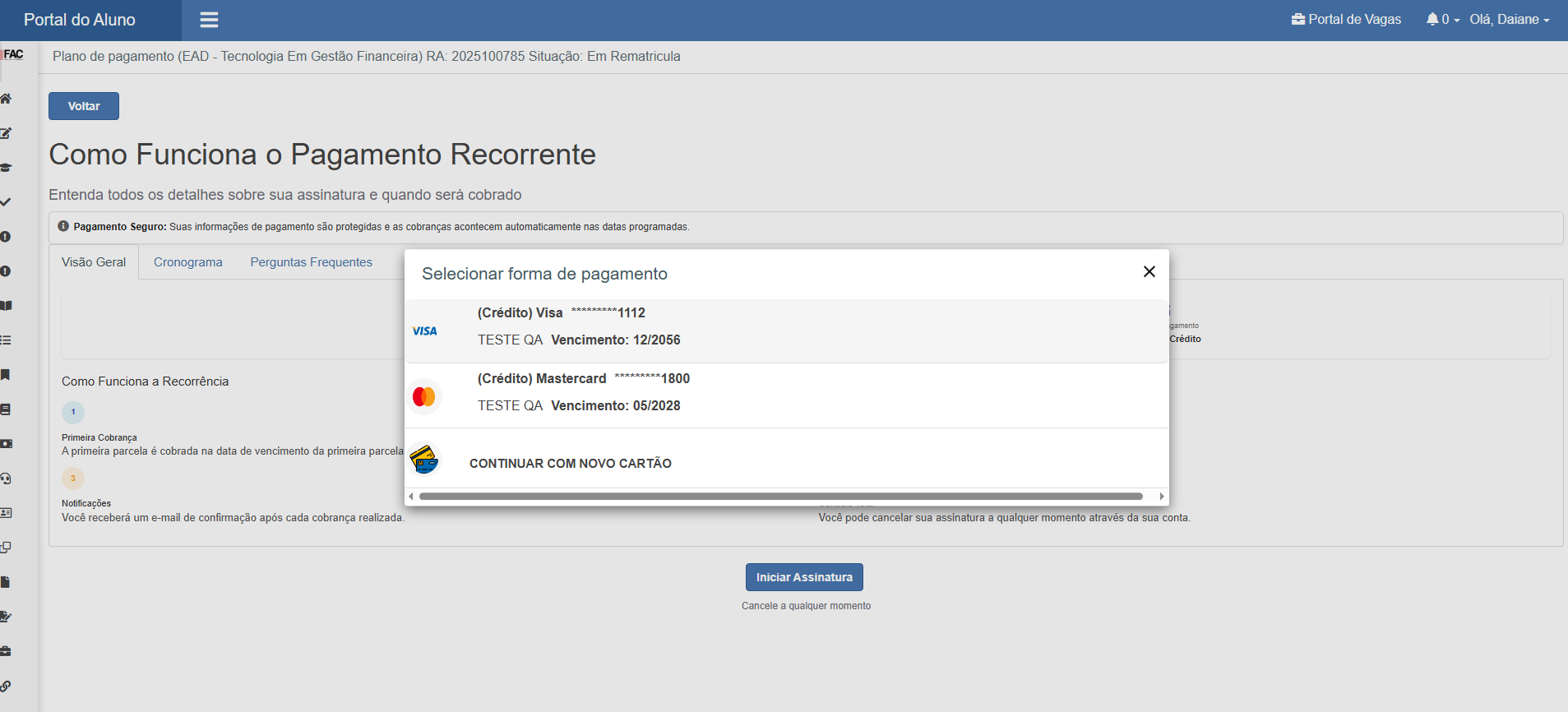 Ao iniciar a recorrência, será mostrada as parcelas que serão incluídas na recorrência e o aluno poderá colocar os dados do cartão para realizar o pagamento.