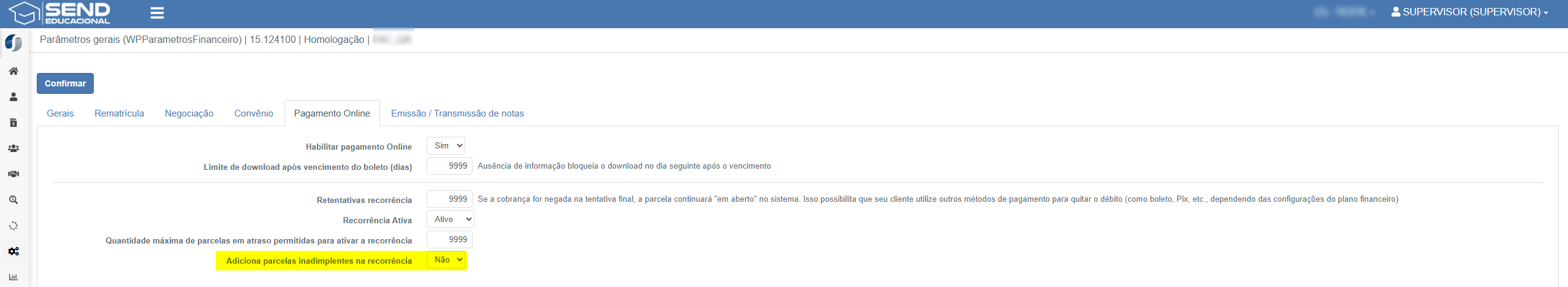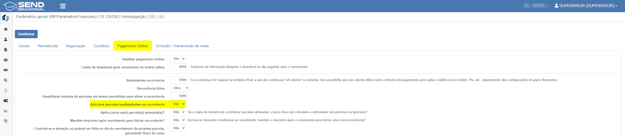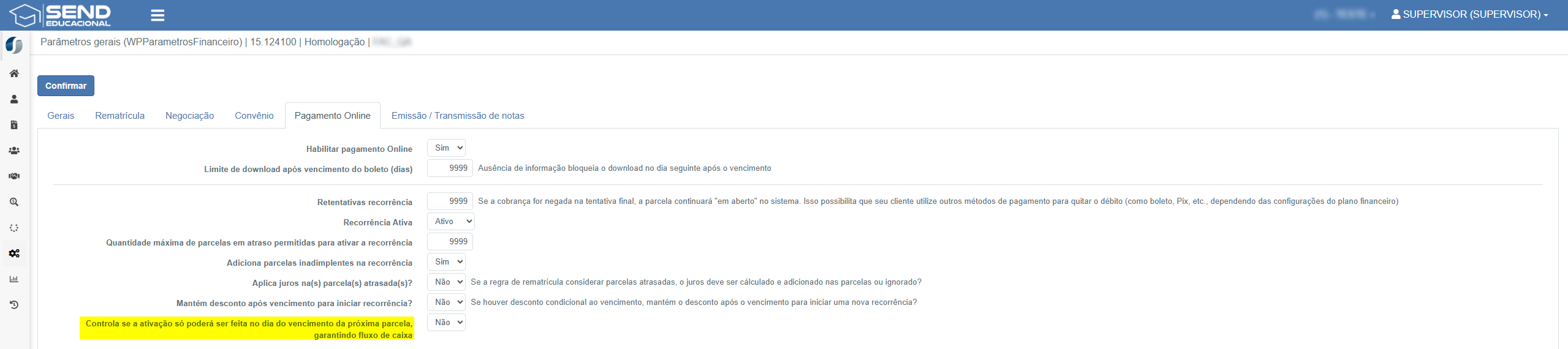 • Nessa solicitação, realizamos a alteração nos parâmetros financeiros, onde agora a recorrência pode acontecer fora do período de rematricula do aluno, e sendo possível realizar recorrência para alunos em inadimplência.