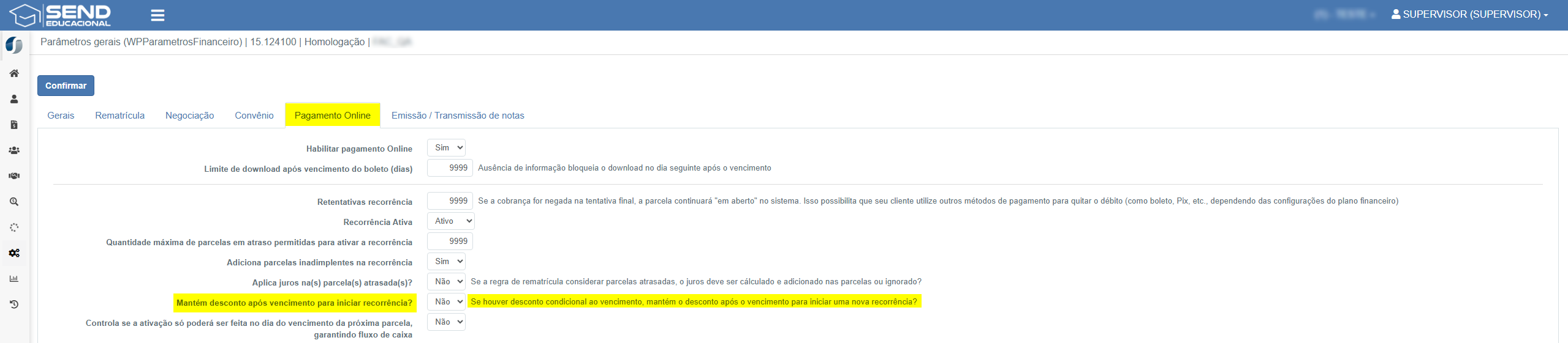 • Função: Define se um desconto condicional ao vencimento (geralmente um desconto por pontualidade no presencial) deve ser mantido caso o aluno opte por iniciar uma nova recorrência após a data de vencimento original da parcela. Com a opção "Não", o aluno perde esse desconto.