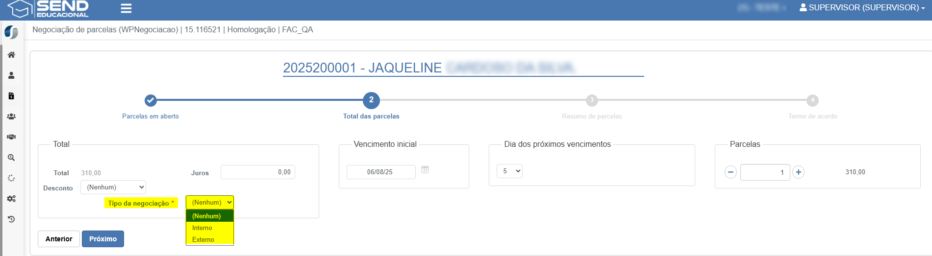 Foram implementadas melhorias importantes no processo de negociação do aluno com o seguinte objetivo: ao gerar uma negociação, o sistema oferece uma nova opção para selecionar a categoria de pagamento, permitindo indicar se o acordo é Interno ou Externo.