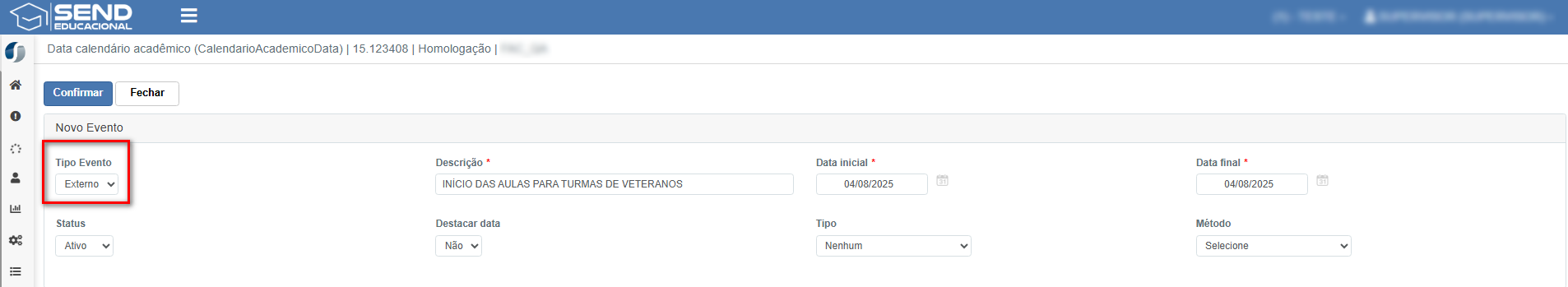 📌 Regra: Somente eventos com do tipo "Externo" serão apresentados no calendário do aluno, eventos do tipo "Interno" só serão apresentados para a secretaria.