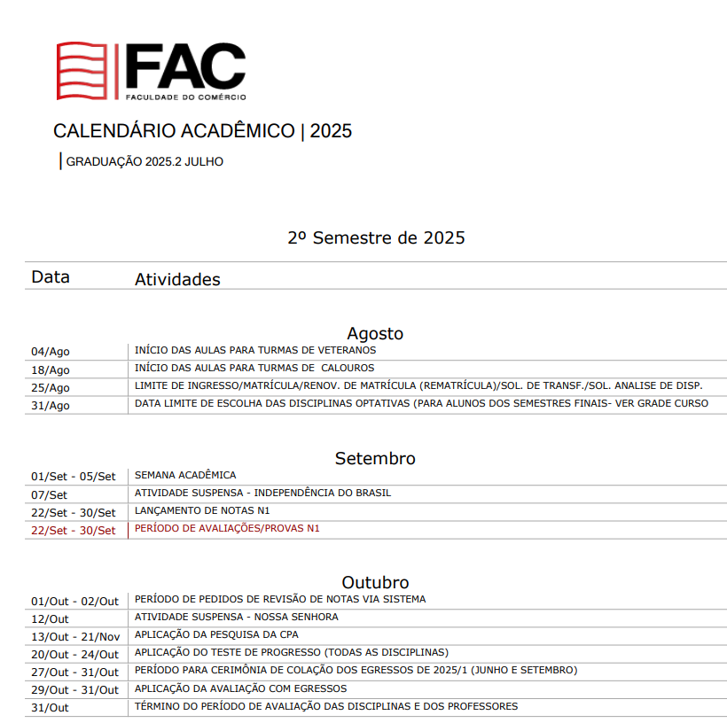 - Realizamos algumas alterações no calendário acadêmico para melhor visualização do aluno e para a secretária