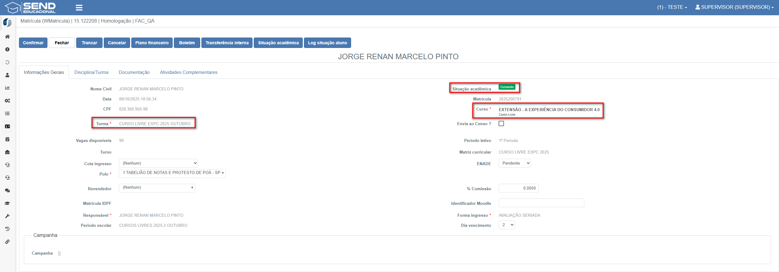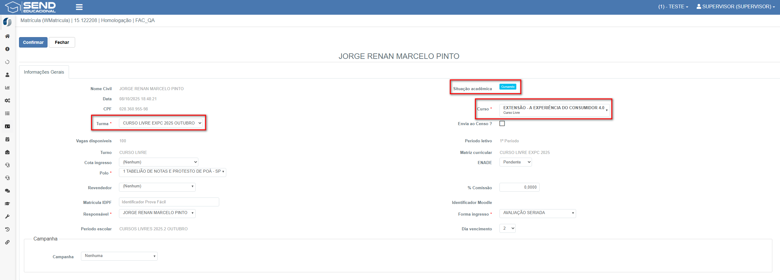 - Os campos Curso e Turma agora estarão desbloqueados.
