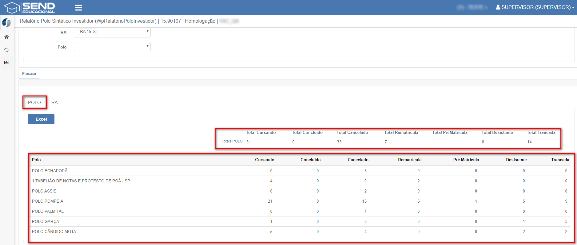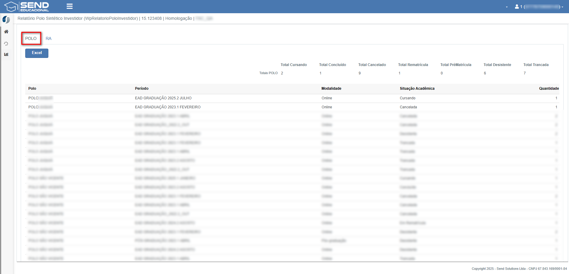 Relatório Polo Sintético Investidor do Send Educacional apresenta uma visão consolidada de alunos agrupados por Polo e RA, permitindo o acompanhamento por modalidade, período escolar e situação acadêmica. A tela fornece indicadores de matrículas, situações e totais gerais de forma visual e organizada.