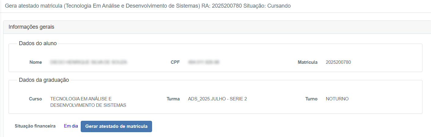 Esta funcionalidade permite ao aluno gerar uma declaração oficial de que está regularmente matriculado no curso, com validade jurídica e acadêmica.