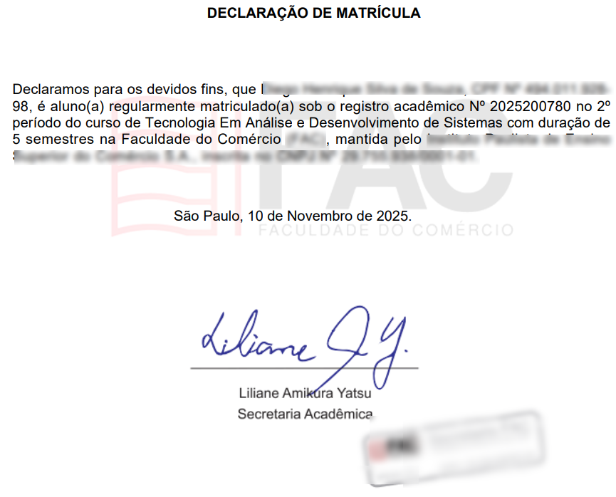 📌 Importante: O atestado possui validade legal e pode ser utilizado para benefícios estudantis, convênios, estágios ou comprovações junto a órgãos públicos e privados.