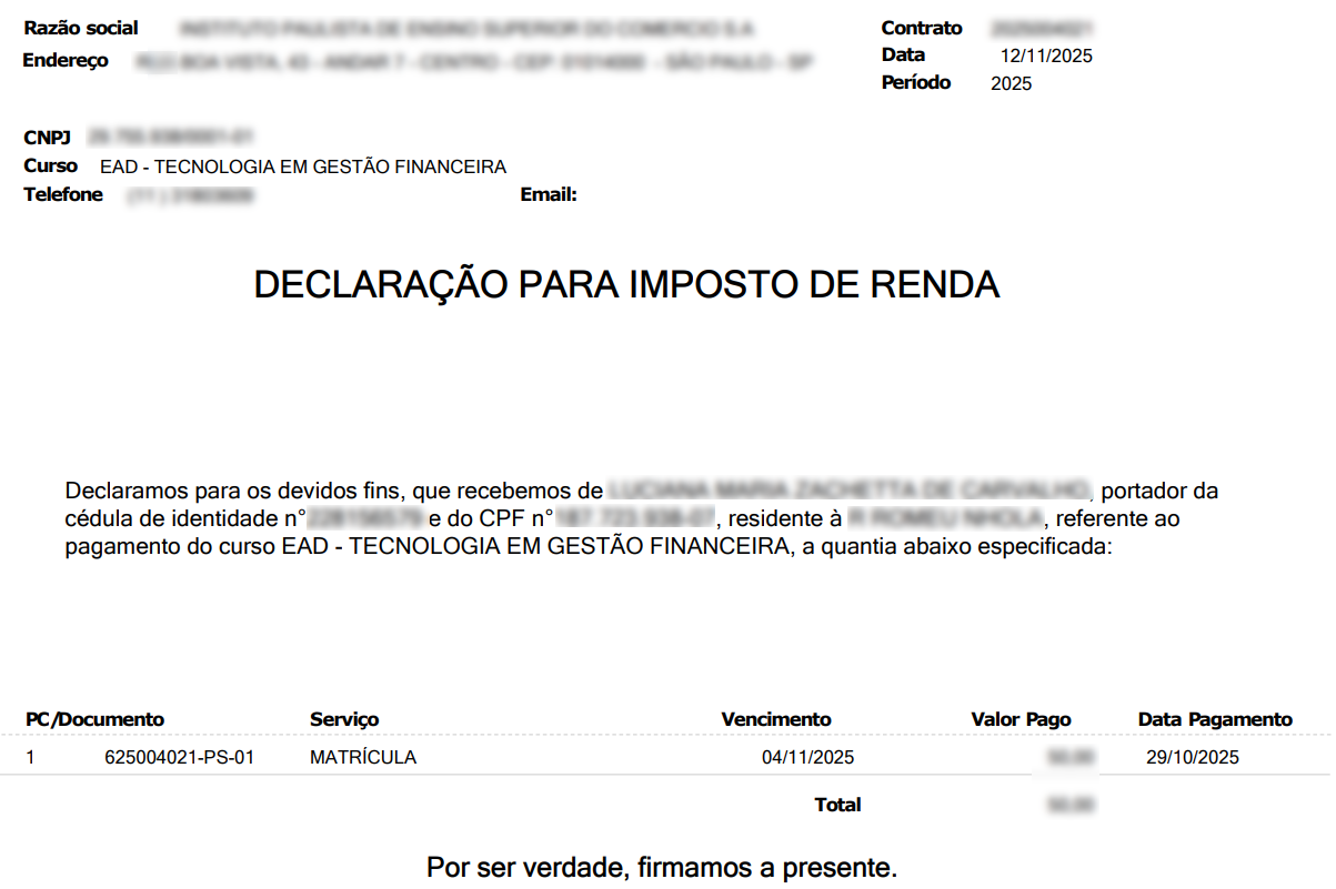 • Destinatário: Nome do aluno responsável financeiro, CPF e curso.
