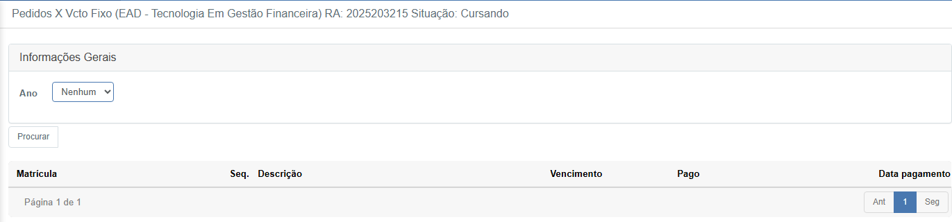 Financeiro – Pedidos X Vencimento Fixo permite ao aluno consultar o histórico de cobranças fixas (como mensalidades ou matrícula), visualizar status de pagamento e gerar comprovantes.