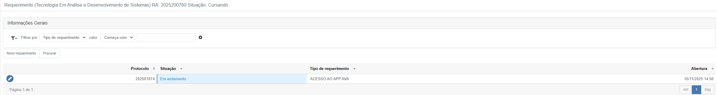 - Tipo de requerimento – Categoria da solicitação (ex.: Acesso ao APP AVA)