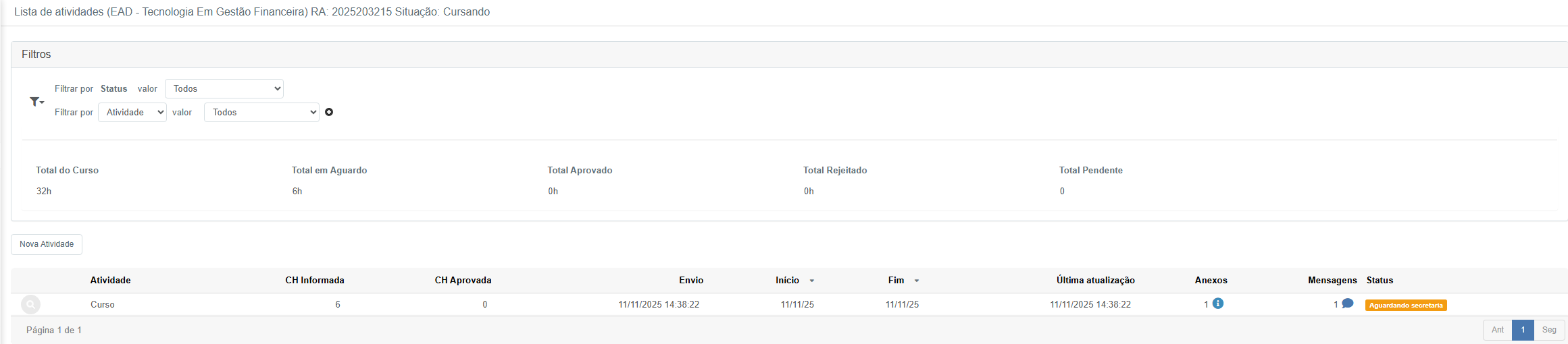 - Mensagens – Comunicação entre aluno e secretaria sobre a atividade.
