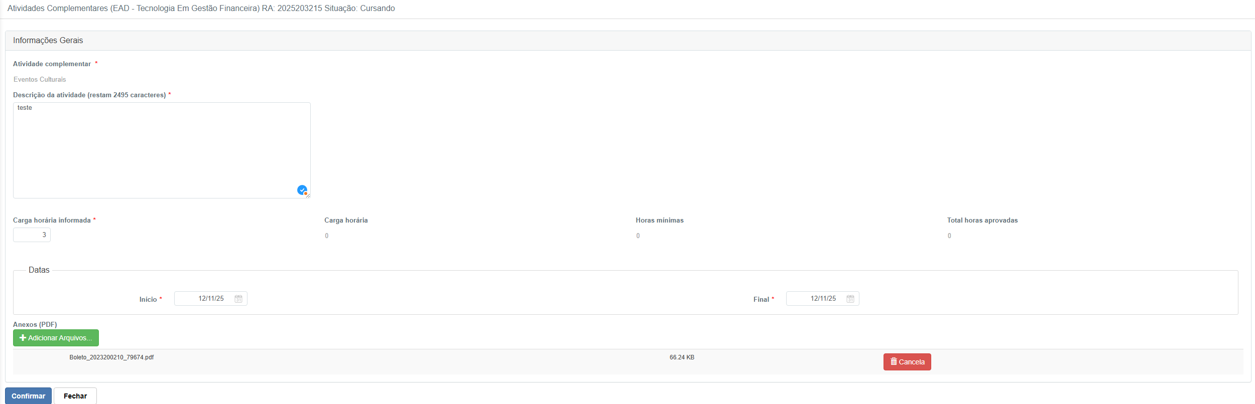 ✅ Após o preenchimento, o aluno deve clicar em Confirmar para enviar a solicitação ou em Fechar para cancelar o envio.