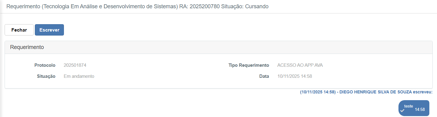 Após o envio, o aluno pode acessar os detalhes da solicitação registrada. Essa tela exibe as informações principais e a comunicação com o setor responsável.