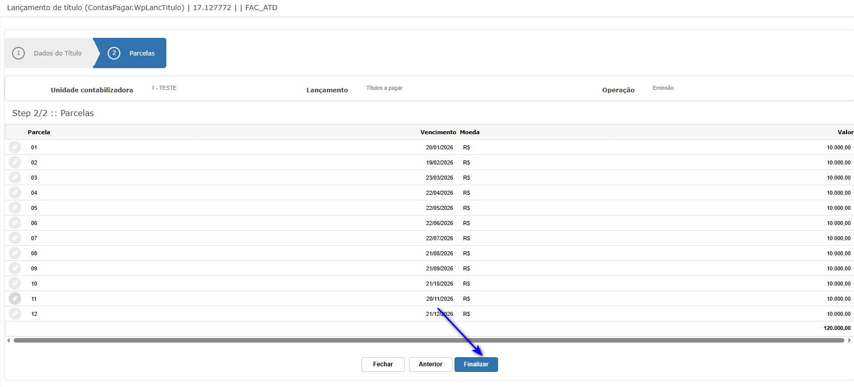Conclusão: O título foi emitido com sucesso e registrado no sistema, pronto para o pagamento conforme as datas configuradas.