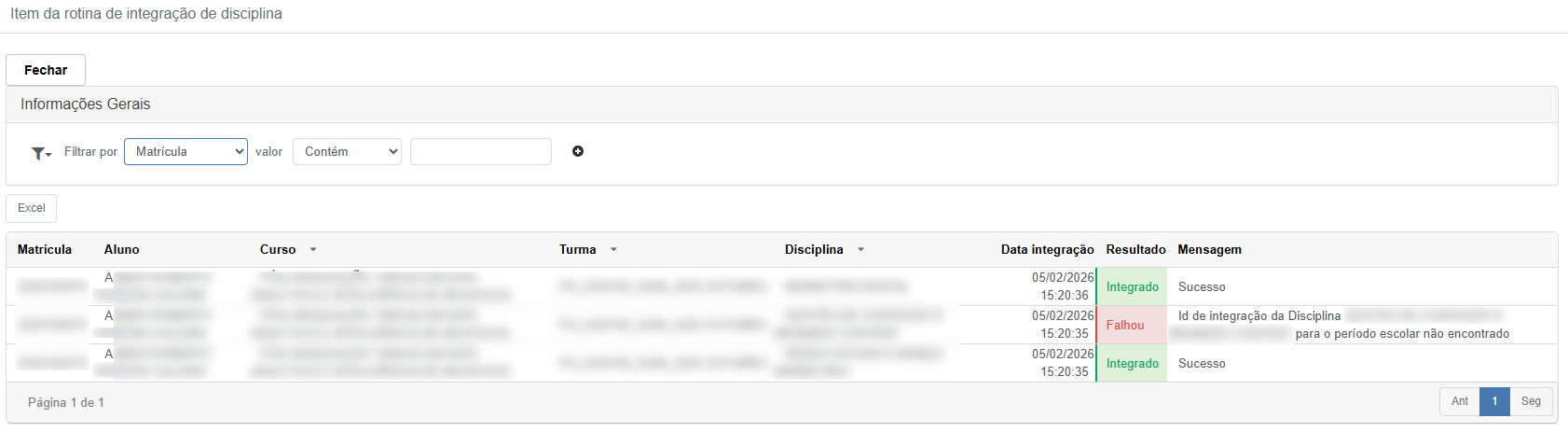 • Objetivo: Ver o detalhamento do que foi integrado em uma execução: aluno, curso, turma, disciplina, data e resultado.