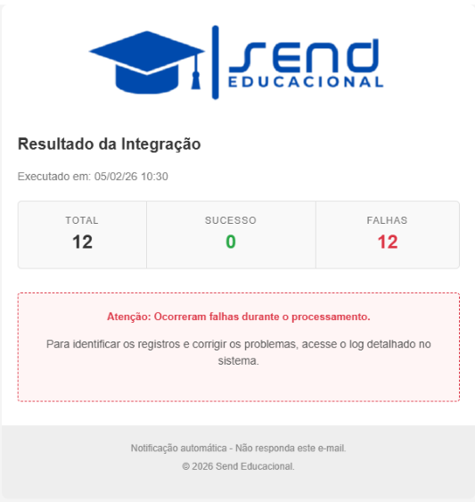 • Resumo de execução: Total de registros, sucessos e falhas.