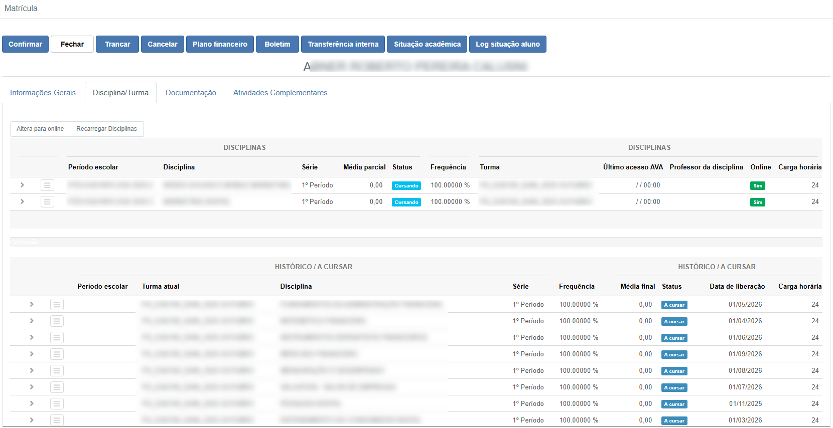 • Quando muda: Após a rotina de integração executar com sucesso, as disciplinas são liberadas no AVA e passam a refletir a situação correta para o aluno.