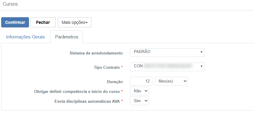 Foi criada uma aba de Parâmetros no cadastro do curso para organizar configurações específicas da integração e, principalmente, controlar se o curso participará da integração automática.