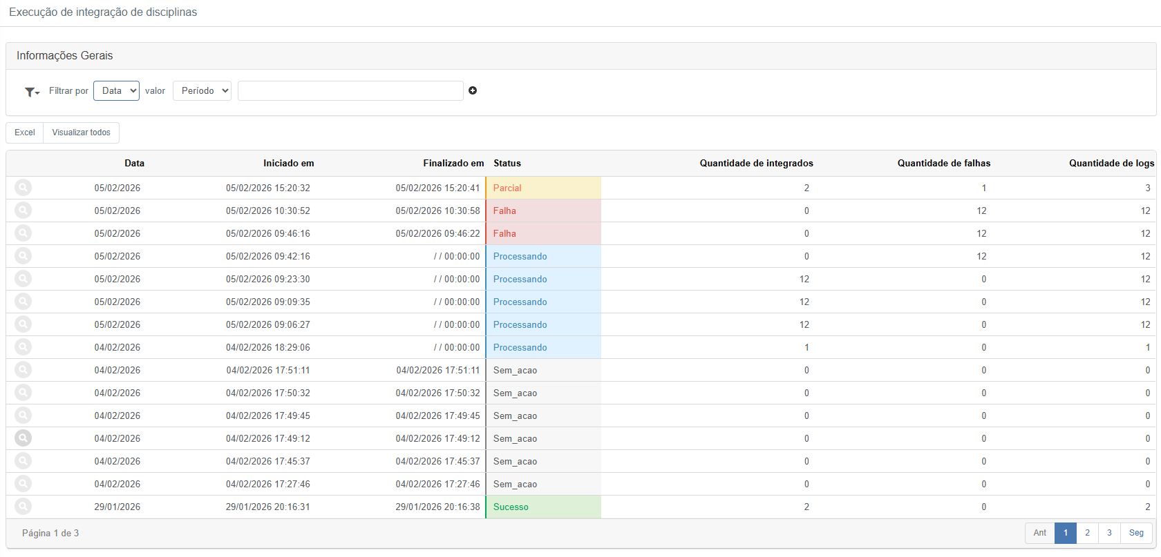 Para dar visibilidade ao processo, foram disponibilizadas telas para monitorar as execuções da integração, identificar falhas e consultar o detalhamento por disciplina/aluno.