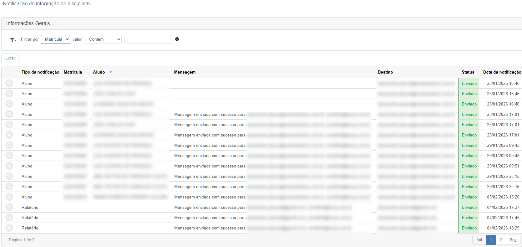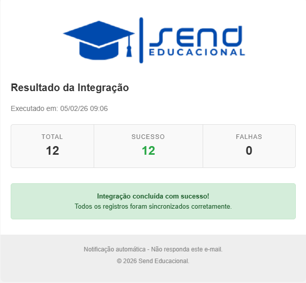 Com a execução da integração, o sistema pode enviar notificações automáticas confirmando o resultado e/ou informando a liberação das disciplinas no período.