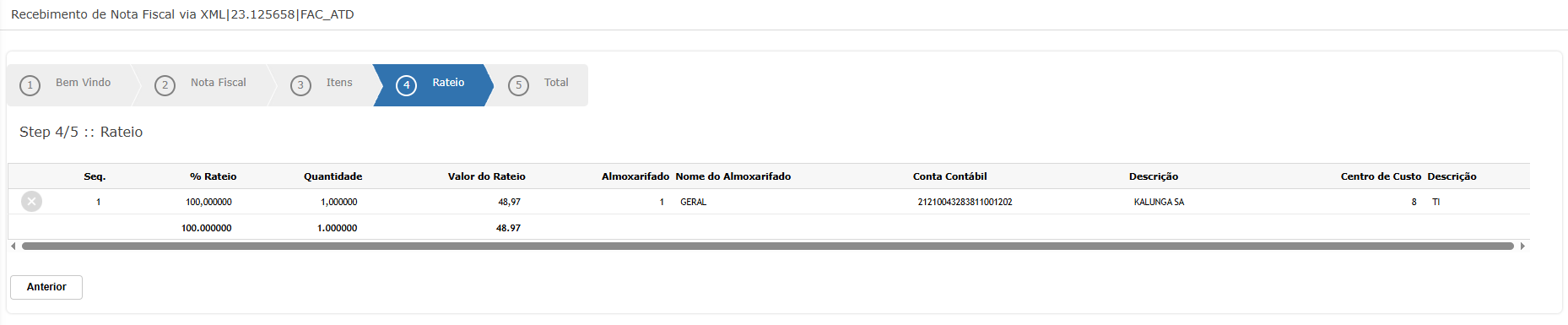 Nesta etapa o sistema apresenta um resumo dos rateios realizados para os itens da nota.