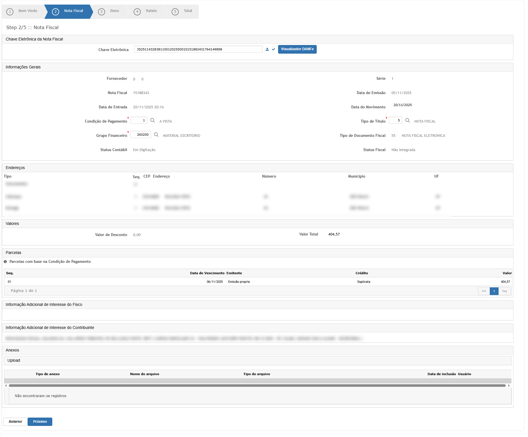 • Informações Gerais – Fornecedor, número e série da nota, datas de emissão, entrada e movimento, condição de pagamento, grupo financeiro, tipo de título, tipo de documento fiscal, status contábil e fiscal.