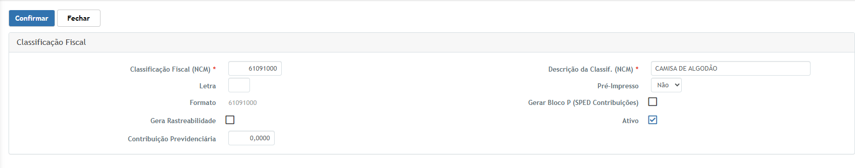 • Classificação Fiscal – Código NCM previamente cadastrado (obrigatório)