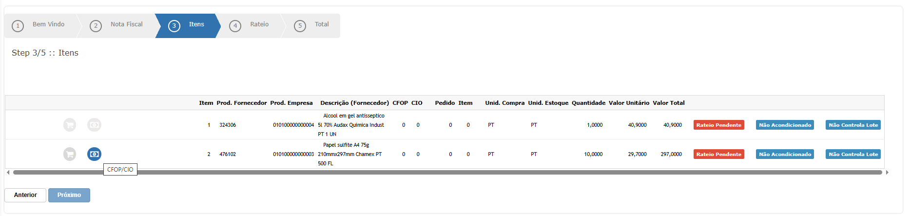 Primeiro, certifique-se de que todos os itens estejam vinculados a um Produto da Empresa. Em seguida ajuste CFOP/CIO quando necessário e prossiga para o Rateio dos itens.