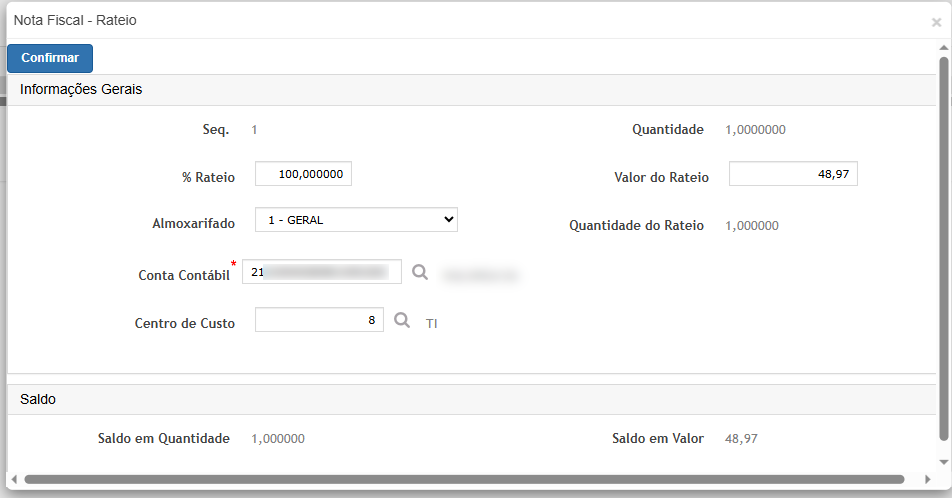 • Saldo – Painel que mostra saldo de quantidade e valor ainda não rateados.