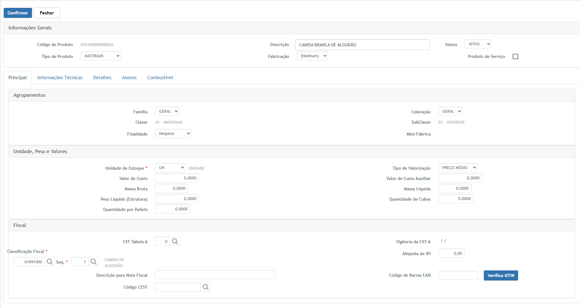 📌 Ponto de Atenção: o produto só deve ser utilizado no recebimento de notas fiscais quando estiver com Classificação Fiscal corretamente vinculada e cadastro em Status Ativo.