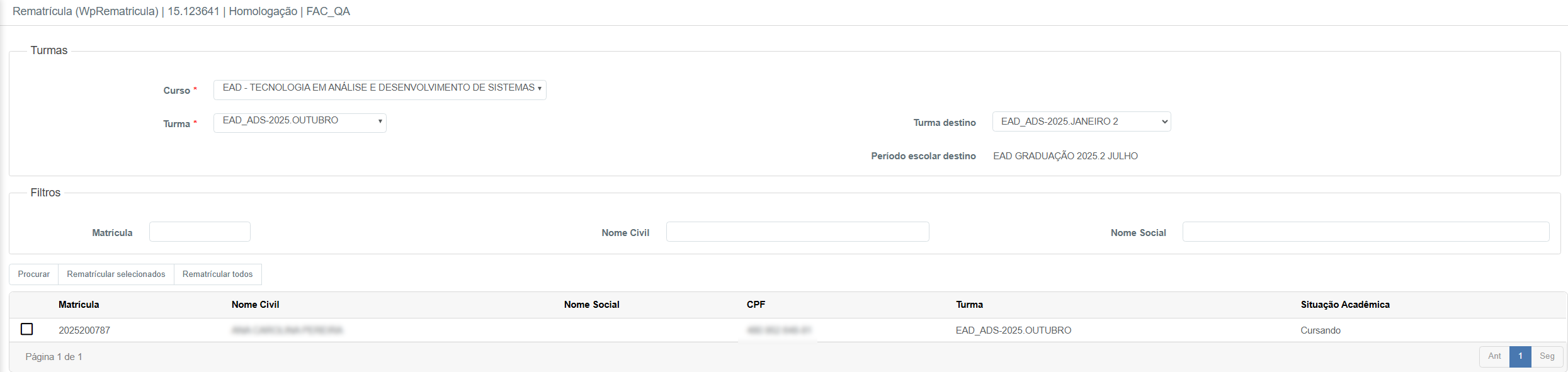Após definir curso, turma, filtros e parâmetros, selecione os alunos e clique em Rematricular para concluir.