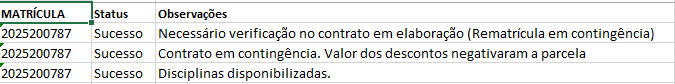 • Após realizar o download do rematricula dos alunos, podemos identificar quais matriculas tiveram sucesso na rematricula, através do excel.
