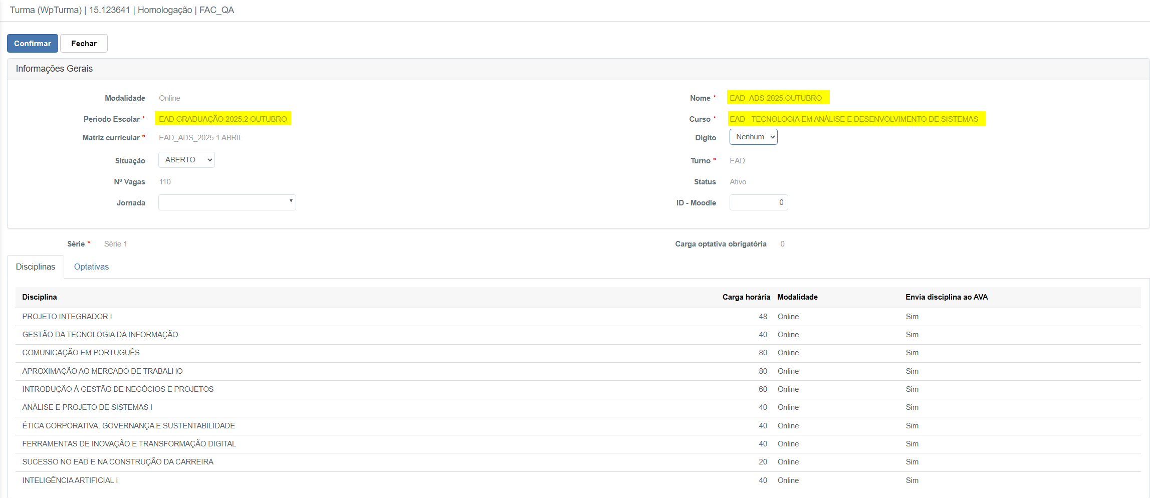 • Turma – Necessário a realização da criação de uma nova turma (destino), onde os alunos serão migrados após a rematricula.