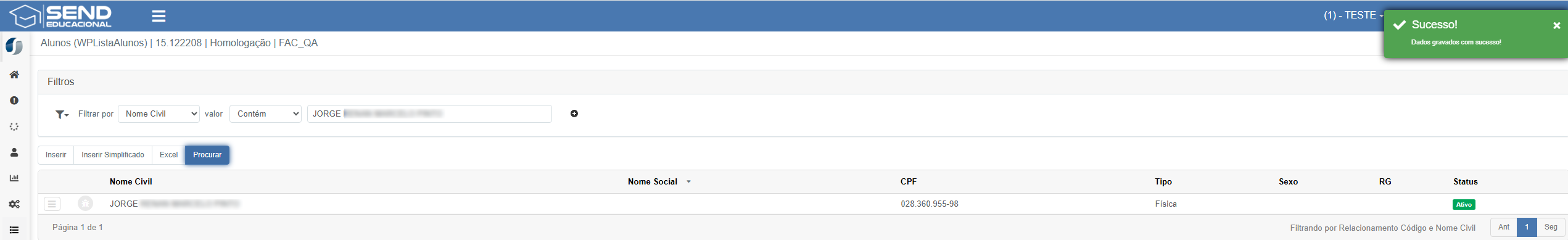 - Valide o retorno de Sucesso e localize o aluno usando os Filtros.