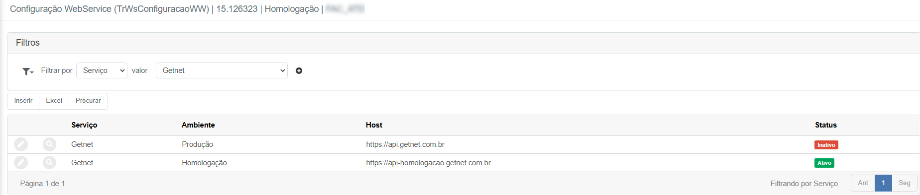 - Filtros de pesquisa – Permite localizar registros por nome do serviço (ex.: Getnet).