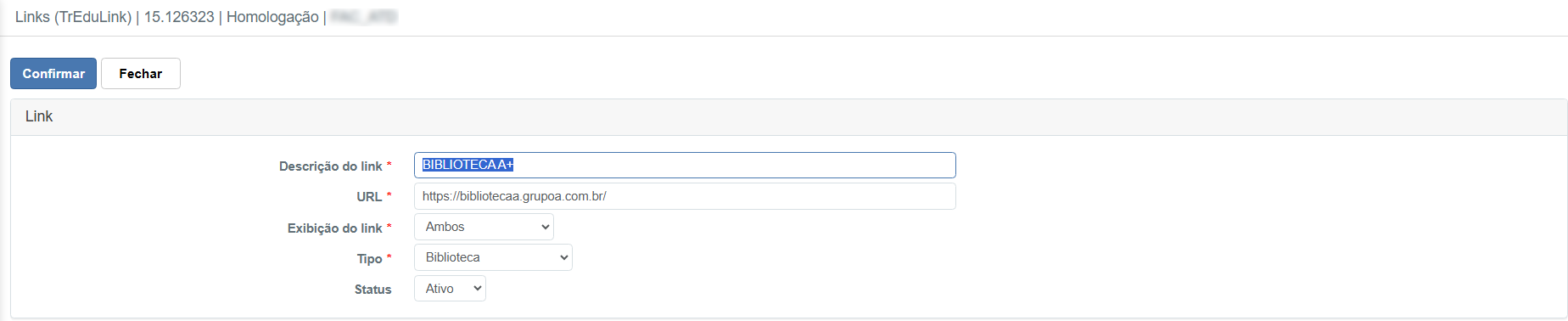 • Descrição do link – Título que será exibido no portal (Ex.: BIBLIOTECA A+)