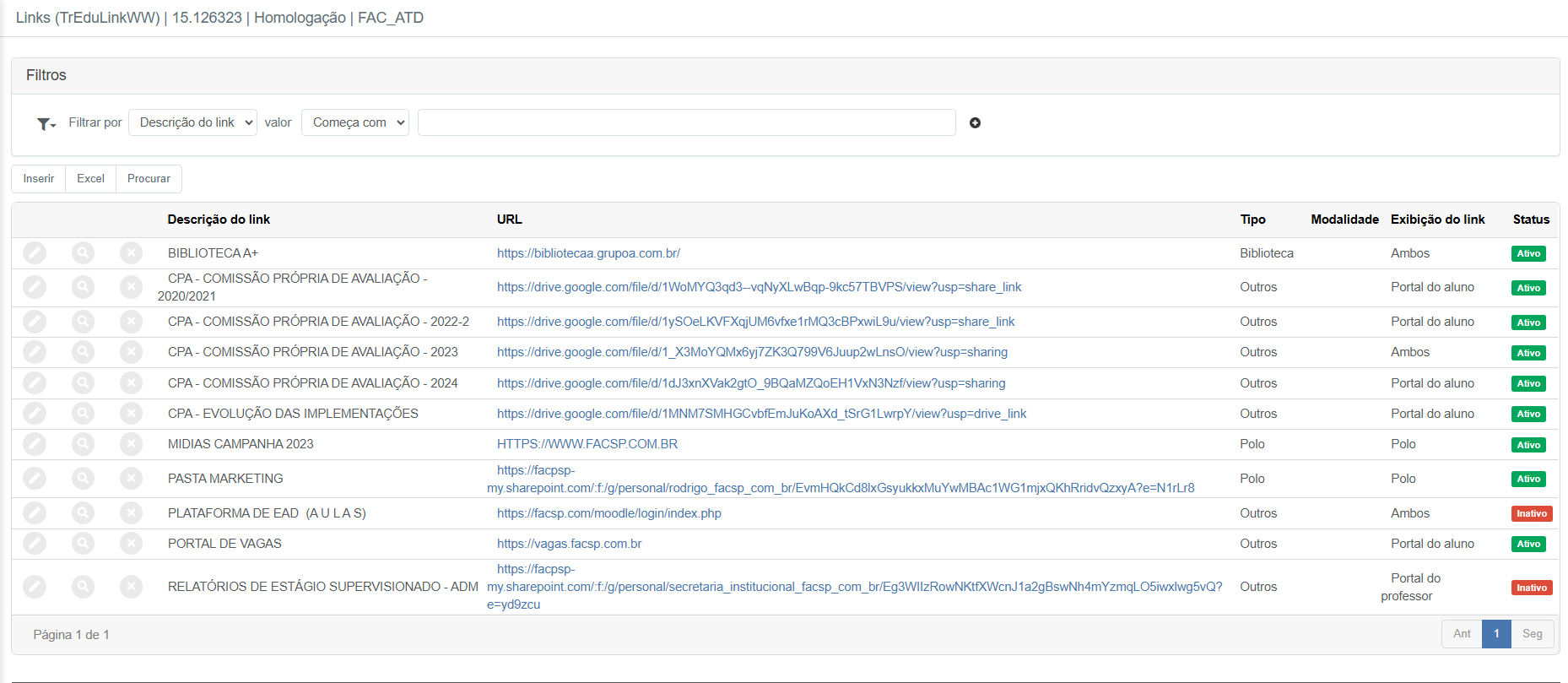 • Tipo – Categoria do link (Ex.: Biblioteca, Outros, Polo)