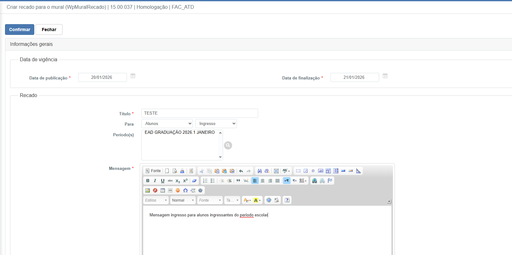 • Mensagem (*): Conteúdo do recado com opções de formatação.