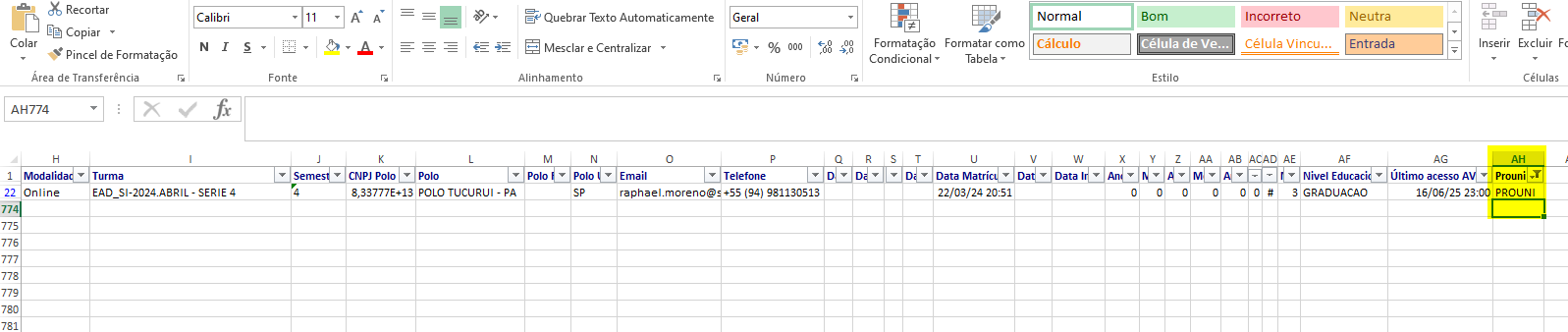 📍 Demais Colunas – Data de conclusão, trancamento, cancelamento e status de acesso AVA.